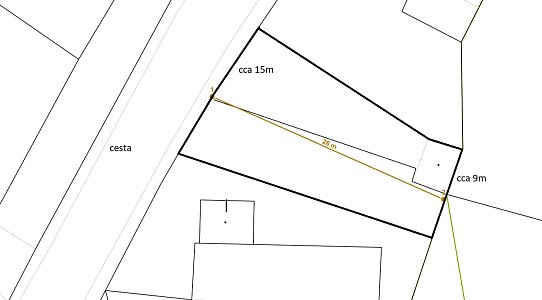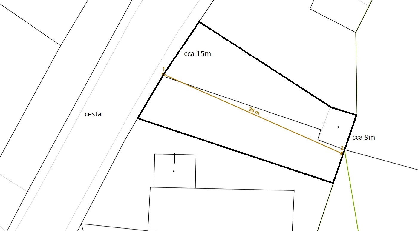 Samotný pozemok je svahovitý o rozmeroch viď. priložený náčrt, ktorý je vhodný na výstavbu rodinného domu, či rekreačnej chaty. Je orientovaný na západ v intraviláne medzi dvomi rodinnými domami. Prístup je po asfaltovej ceste.